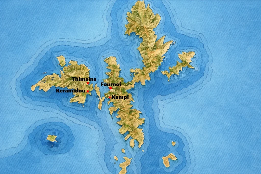 Архипелаг Fournoi Korseon (Фурни Корсеон, или просто Фурни, Φούρνοι Κορσέων (греч.)). Это группа более чем из двенадцати небольших островков. Расположен к юго-западу от острова Samos (Самос) и к юго-востоку от острова Ikaria (Икария).
